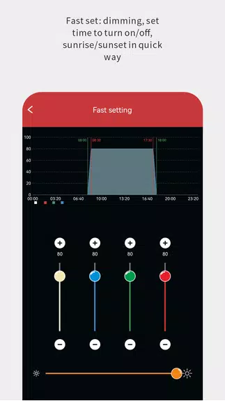 Adjust essential lighting parameters effortlessly – control brightness levels, schedule on/off times, and simulate natural daylight cycles with sunrise/sunset modes. Our streamlined interface puts powerful customization at your fingertips.