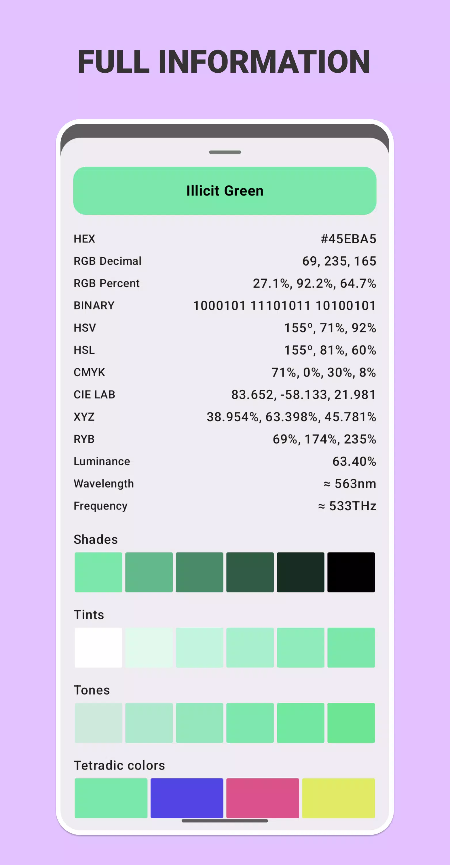 高度なモバイルアプリでカラーポテンシャルを最大限に引き出しましょう! 任意の画像やライブカメラ映像から簡単に色をキャプチャし、識別できます。 画像を撮影するか、カメラを向けるだけで、アプリが即座に色を検出し、色名、HEXコード、RGB値(パーセンテージおよび小数表示)、HSV、HSL、CMYK、XYZ、CIE LAB、RYBなどを表示します。 色の正確な名前と正確なトーンが、すぐに手元に届きます!