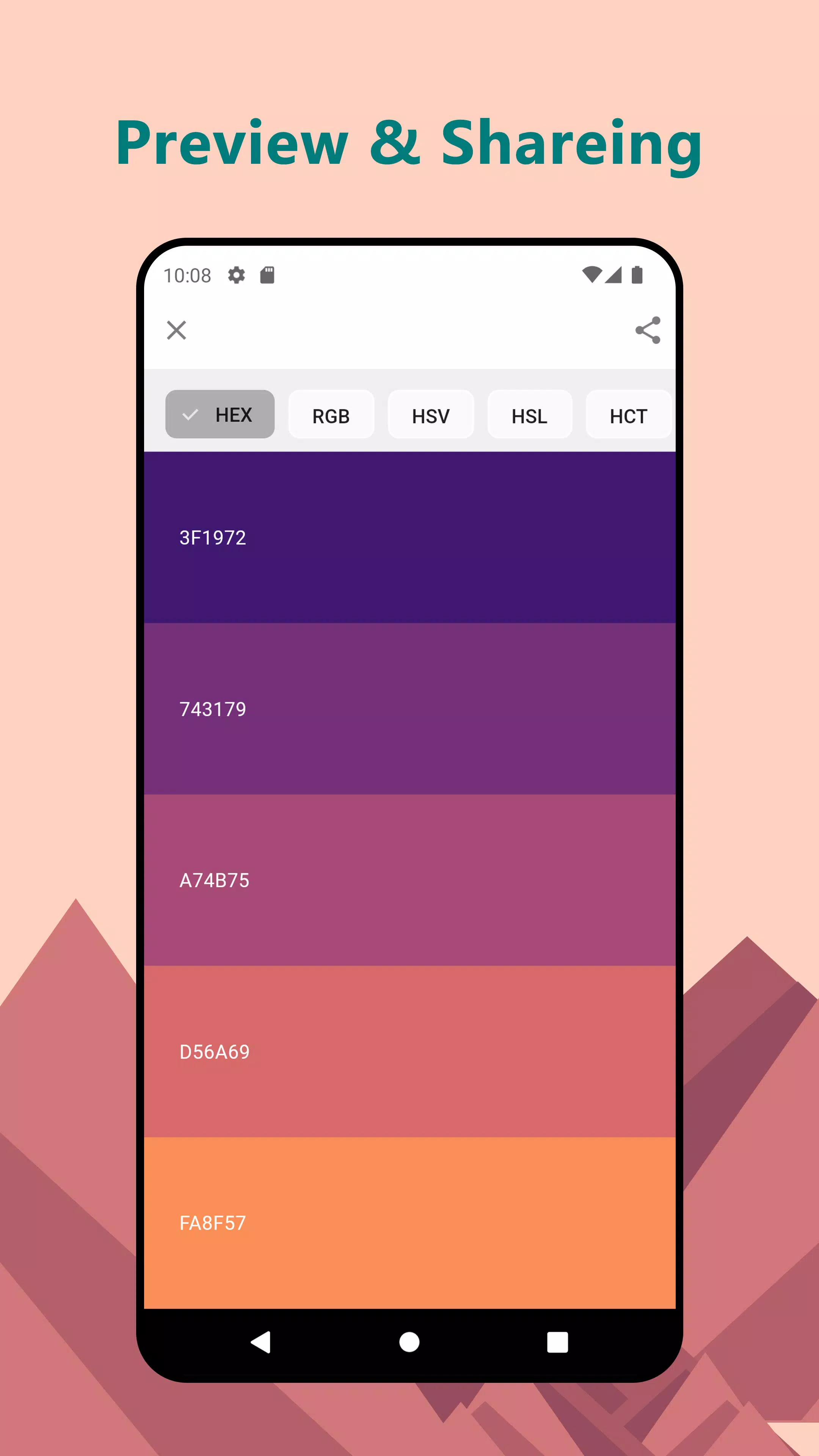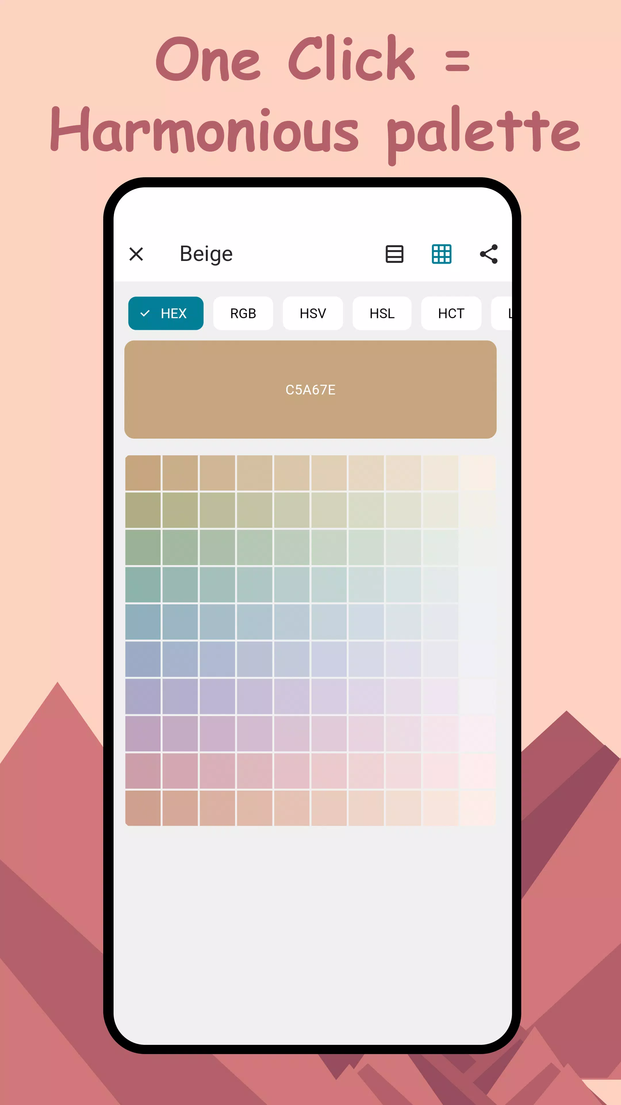 · 分享 - 轻松复制颜色代码或以图片形式分享配色方案。支持以 Hex、RGB、HSV/HSB、HSL、LAB 和 HCT 格式导出和分享。
